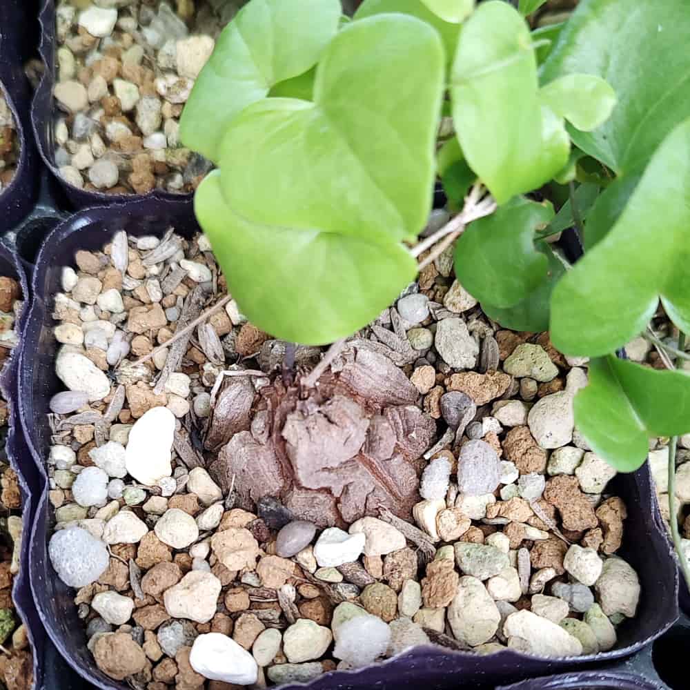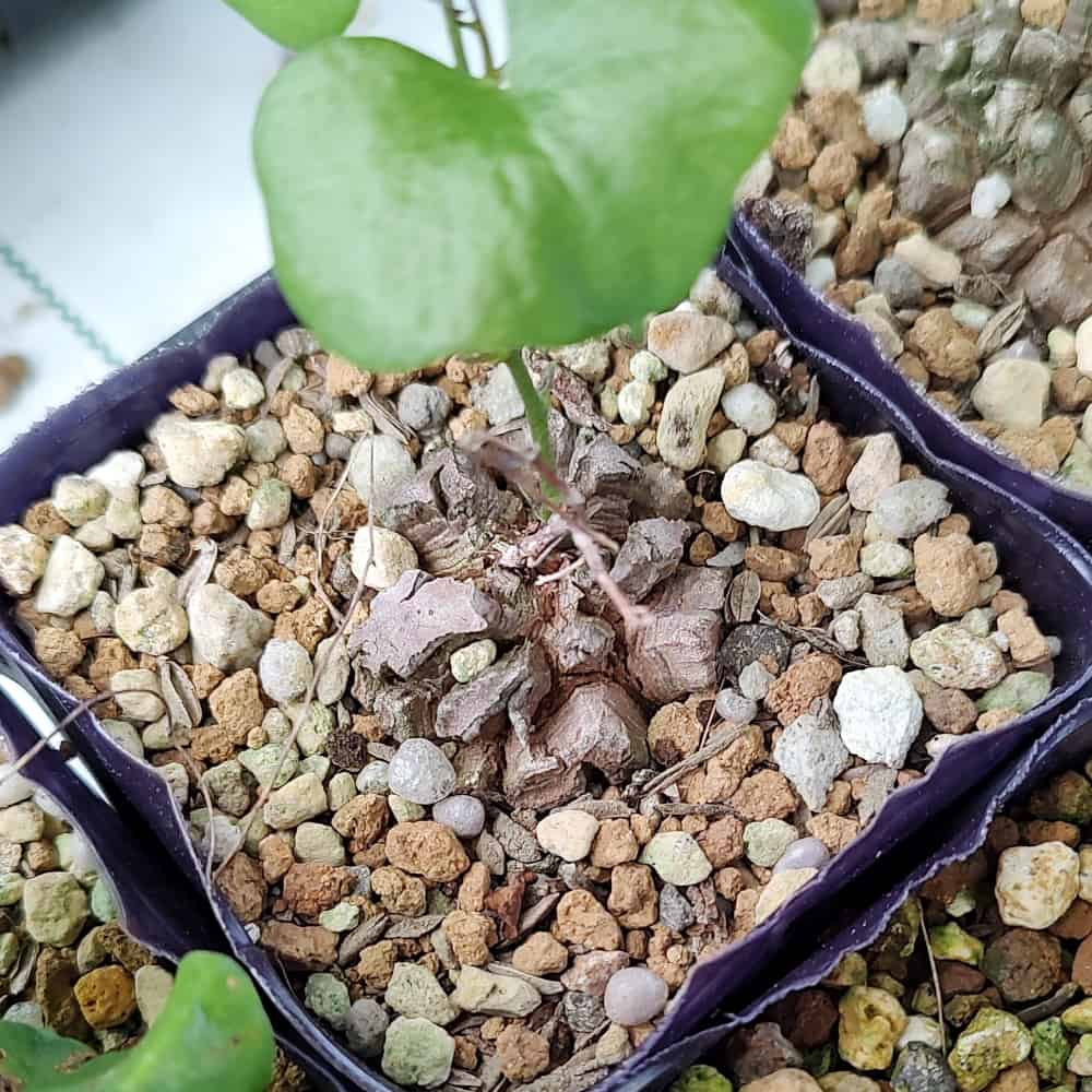 春になり夜温が10度以上になってきましたら、植え替えて塊根部を出してあげると格好良く見栄えのある状態になるかと思います。